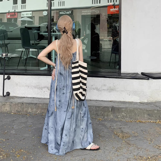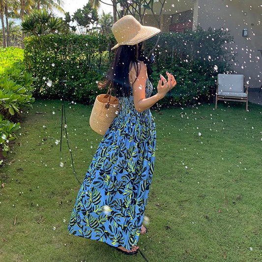【ワンピース】蝶柄 花柄ノースリーブワンピース レディース 夏 ゆったり リゾート風 バックレス エレガントロングドレス【SHシリーズ】