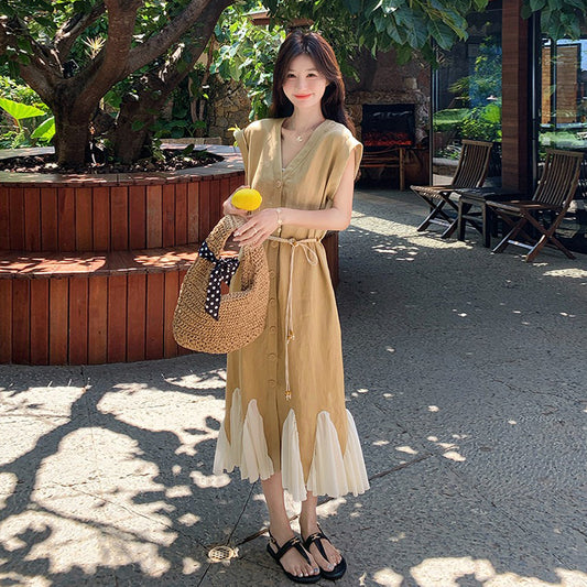 【ワンピース】 上品Vネック ノースリーブワンピース レディース 夏 フレンチ風 大人っぽ 高級感 ウエストマーク細見え ロング丈ドレス【JZシリーズ】