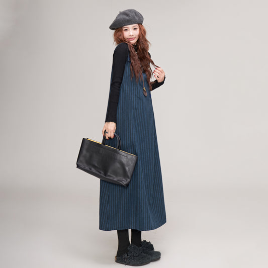 【ワンピース】上品スクール風 ブルーストライプ サロペットスカート レディース 秋冬 ゆったり ウールノースリーブワンピース【JZシリーズ】