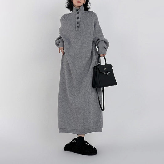 【ワンピース】春秋冬 ハイスリット ハイカラー ミモレ丈 ニット 長袖ワンピース 【AHシリーズ】