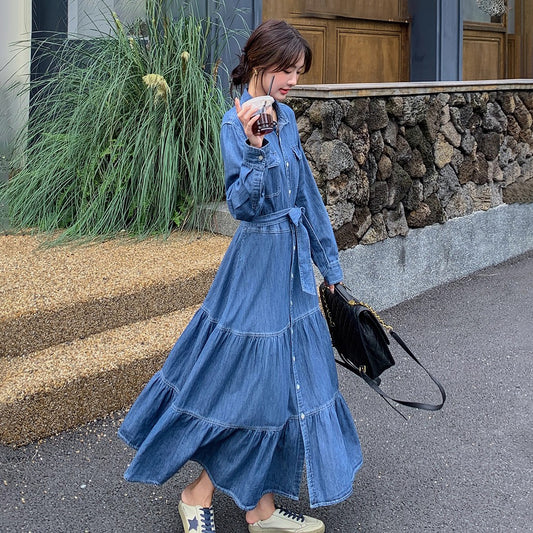 【ワンピース】高級感レトロ デニム 長袖シャツワンピース 人気 ウエストマーク ロングワンピース【JZシリーズ】