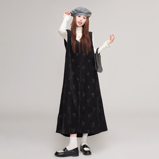 【ワンピース】Vネック 蝶リボン プリント サロペット 秋冬 レディース ベルベットノースリーブワンピース【JZシリーズ】