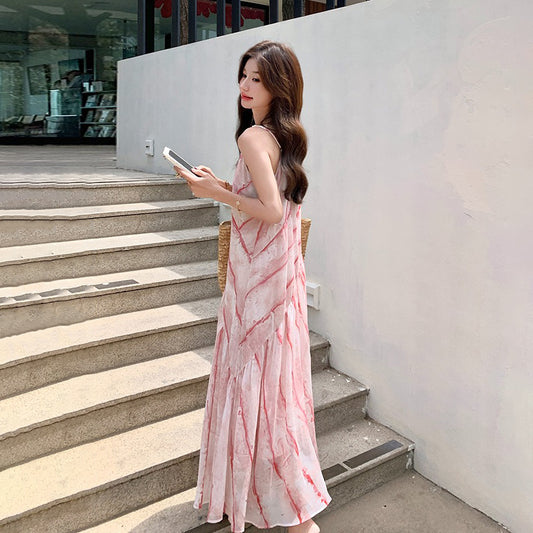 【ワンピース】レトロ油絵プリント ビーチバカンス 夏 高級感 ノースリーブワンピース【SHシリーズ】
