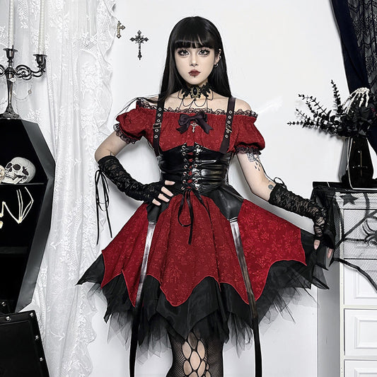 【ハロウィン】 ダークスタイル エレガント ワンピース+ベスト ゴシック 膝上 レッド+ブラック ワンピース
