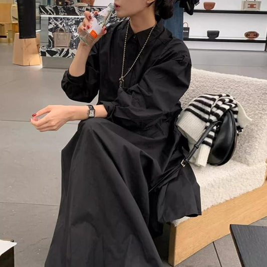 【ワンピース】秋新作 ダーク系 プリーツ切り替え シャツワンピース レディース 長袖 ゆったり 細見え ロング丈【JZシリーズ】