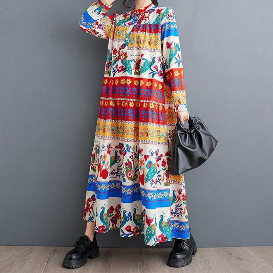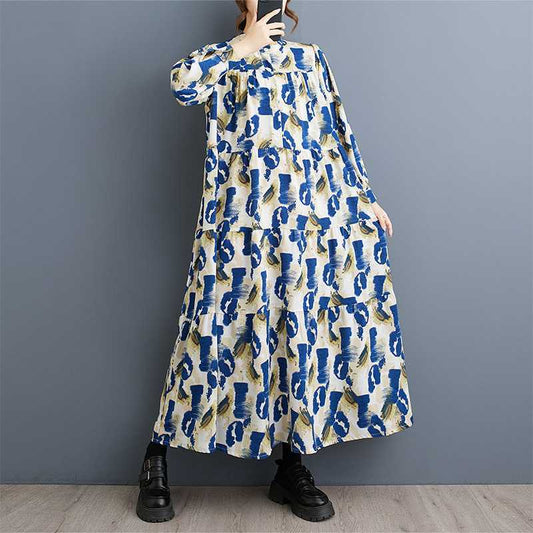【ワンピース】大きいサイズ レディース 韓国風 プリント 長袖ワンピース 秋新作 ゆったり 上品 レトロ文芸スタイル【SHシリーズ】