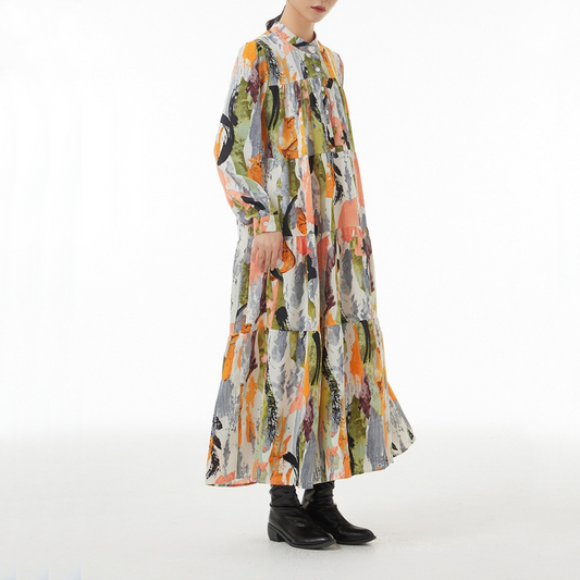 【ワンピース】春秋冬 大振裾 花柄 ゆるリラックス シック 長袖 ワンピース【SHシリーズ】