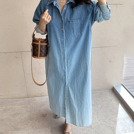 【ワンピース】秋 長袖ワンピース レディース デニム 丸首 ゆったり ミディ丈 森ガール風 文芸 ナチュラル コーデ【JZシリーズ】