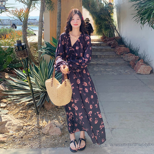 【ワンピース】春秋 花柄ゆったり 長袖ワンピース レディース カジュアル&オシャレ 韓国風 ロング丈【JZシリーズ】