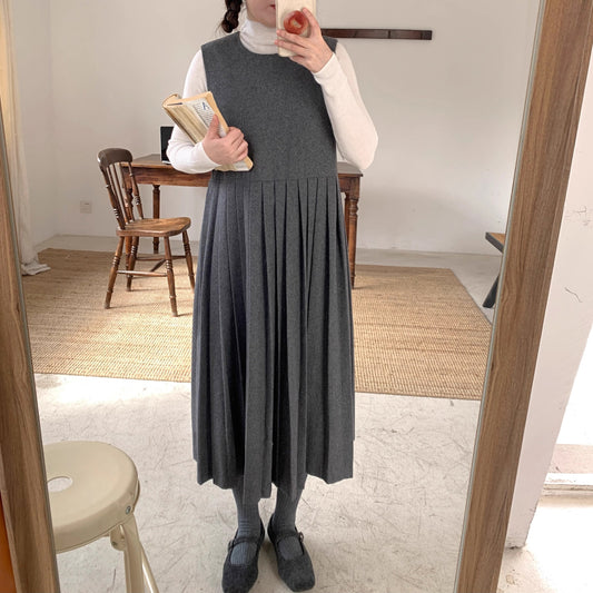 【ワンピース】春秋冬 ウール ラウンドネック プリーツ レトロ ノースリーブ ベスト ワンピース
