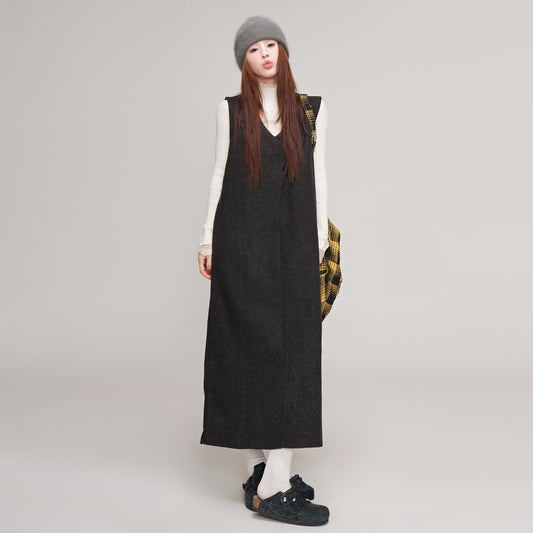【ワンピース】ウール レディース 秋冬 ゆったりVネック 後ろスリット入り 体型カバー ノースリーブワンピース【JZシリーズ】