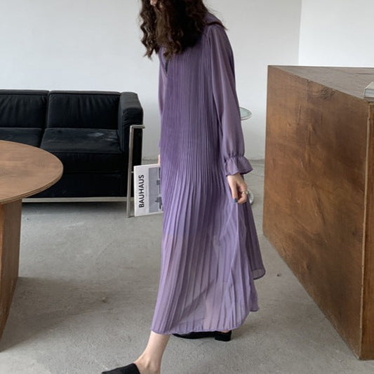 【ワンピース】春秋夏 Chic シフォン ルーズ パープル プリーツ 長袖ワンピース