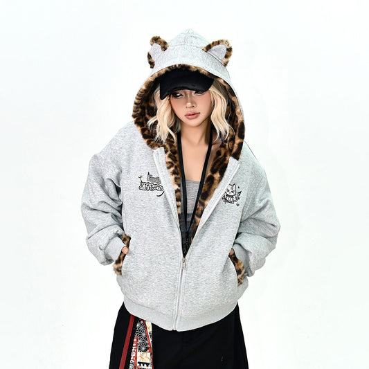 【アウター】レオパード 猫耳 フード付き 綿入れコート 冬 ゆったりBF風 アメカジ 学院風 カップルペア【FCシリーズ】