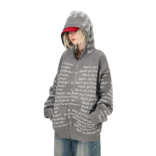 【アウター】総柄レタリング ニットカーディガン レディース ゆったり BF風 アメリカン カップル向け トレンド【FCシリーズ】