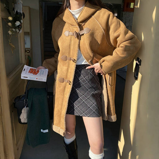 【アウター】 秋冬 スエード ホーンバックル フード付き コート