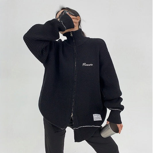 【アウター】春 秋 冬 厚手 スタンドカラー ゆったり ニット ジャケット 【FCシリーズ】