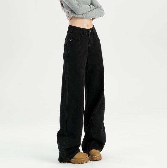 【ボトムス】 春秋冬 スリムワイドデニム ハイウエスト ストレート ゆったり ロングパンツ