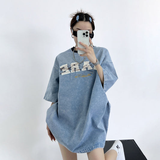 【トップス】夏 レトロ ルーズフィット ダメージ加工 薄デニム 刺繍 Tシャツ【FCシリーズ】