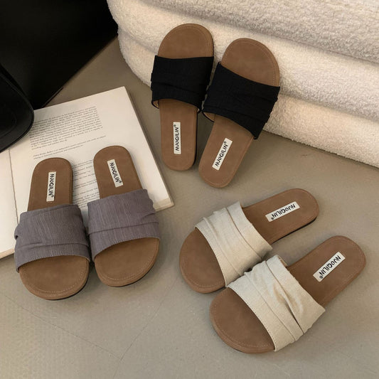 【シューズ】リゾート風 ビーチ リネン プリーツ フラットサンダル 外履き 夏用