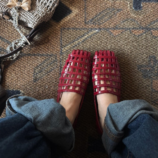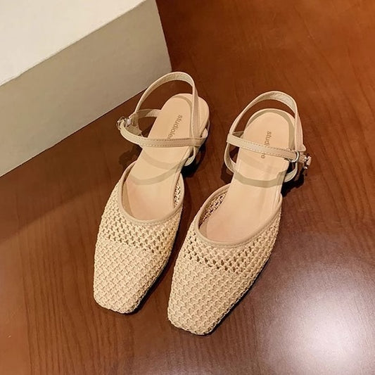 【シューズ】編み込みデザイン スクエアトゥ ワンストラップ バレエシューズ サンダル