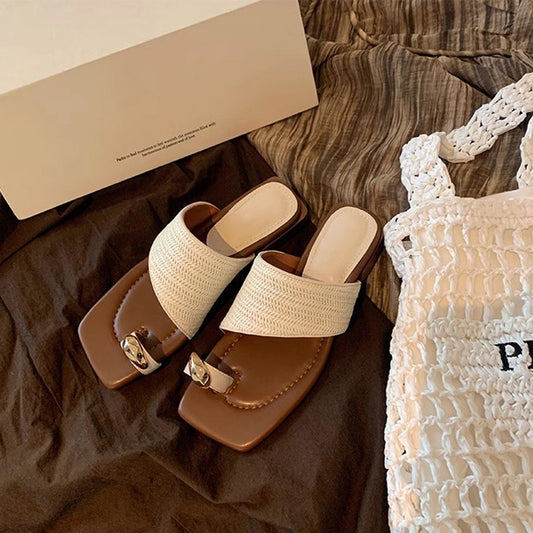 【シューズ】夏季新作 / リゾート風 ジョイントタイプ 気品あるスクエアトゥ 編み込み デザイン サンダル