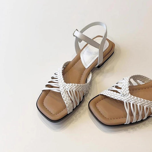 【シューズ】スクエアトゥ フレンチ風 ローヒール 編み込みサンダル