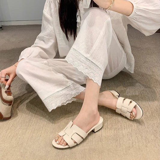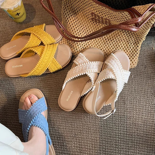 【シューズ】フレンチレトロ 編みデザイン つま先あり バブーシュ 外履き対応 通気性サンダル