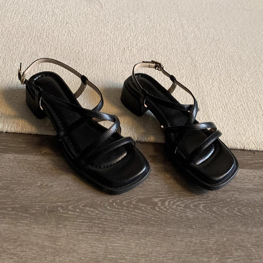 【シューズ】フレンチヴィンテージ クロスストラップ スクエアトゥサンダル 太ヒール ローマ風 新作