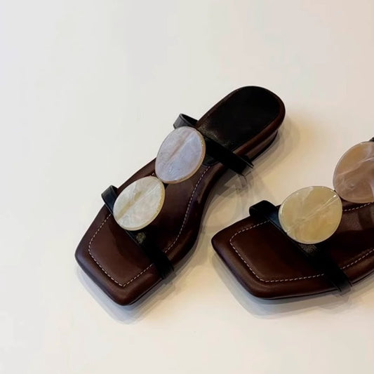 📈 注文殺到中【シューズ】おしゃれな メタルトゥカバー付き スクエアトウ フラットサンダル