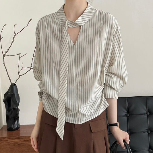 【トップス】韓国系上品デザイン ストライプ柄ボウタイシャツ 長袖シャツ【JZシリーズ】