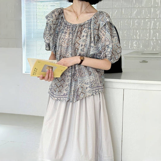 【トップス】夏 パフスリーブ レトロ 花柄 半袖 シャツ 【SHシリーズ】