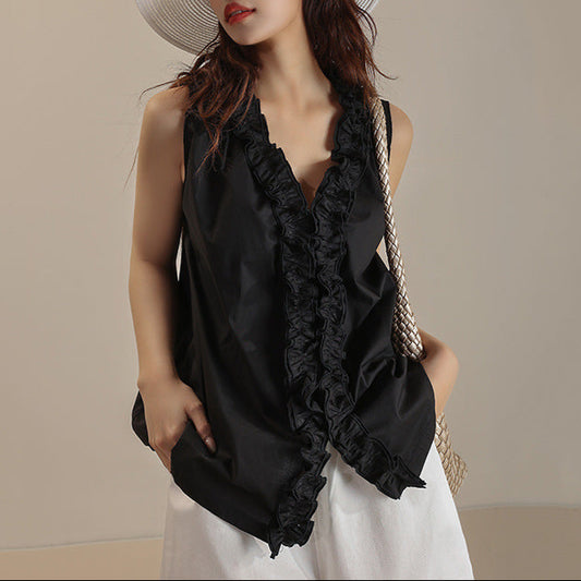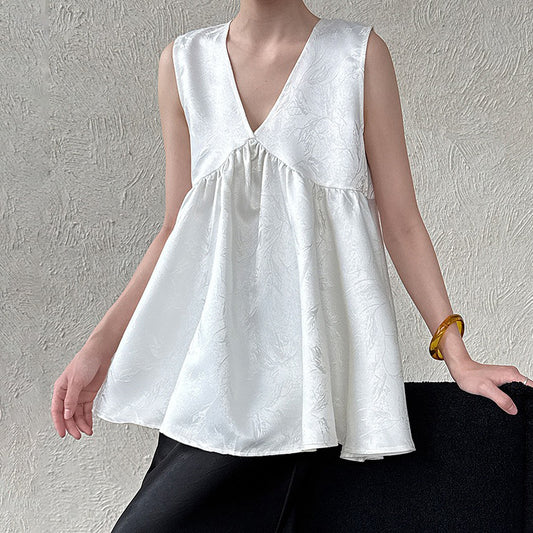 【トップス】重工サテン刺繍 Vネック ベスト 夏 高級感 ノースリーブシャツ【SNシリーズ】