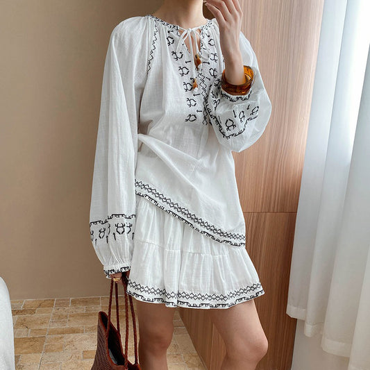 2点セット!【セットアップ】初秋新作 民族風刺繍トップス ブラウス+ミニスカート 上下セット|ゆったりシルエット レディース【SHシリーズ】