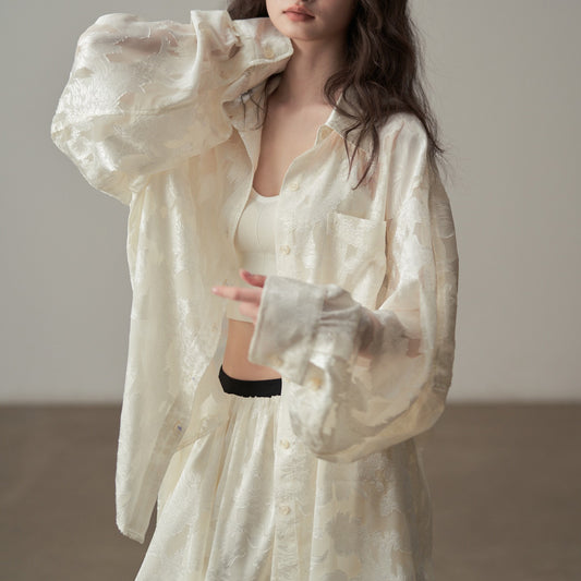 【トップス】ニューチャイナ風 ジャカード長袖シャツ|レトロ肌感×ゆったりシルエット UV対策にも【JZシリーズ】