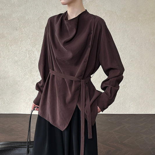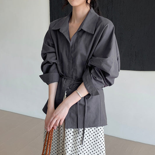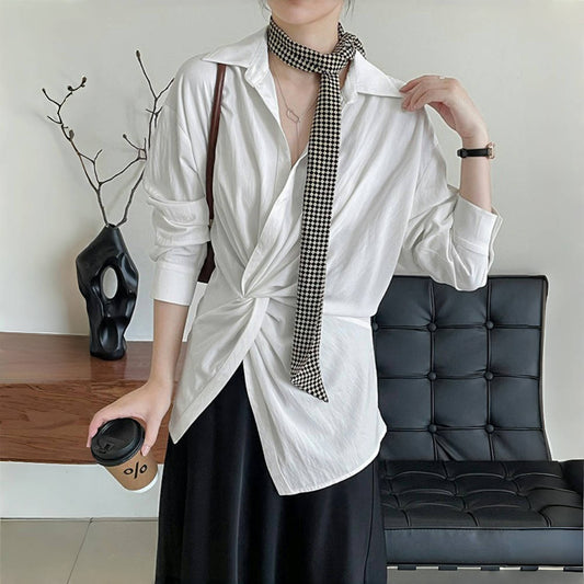 【トップス】韓国系×フレンチスタイル ウエスト結び デザインシャツ アシメ長袖【JZシリーズ】