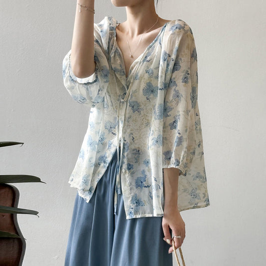 【トップス】レトロ 長袖 UVカット シャツ レディース 天丝素材 花柄 薄手 万能アイテム【JZシリーズ】【SHシリーズ】