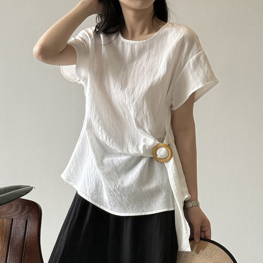 【トップス】夏新作 フレンチエレガンス テンセルリネン 半袖ブラウス 上品ラウンドネック デザインシャツ 【JZシリーズ】