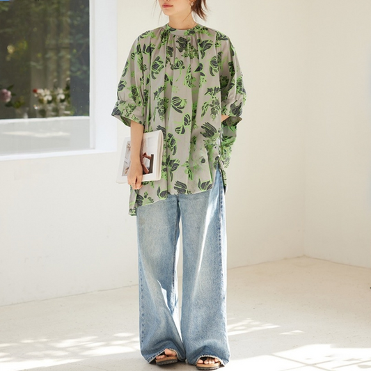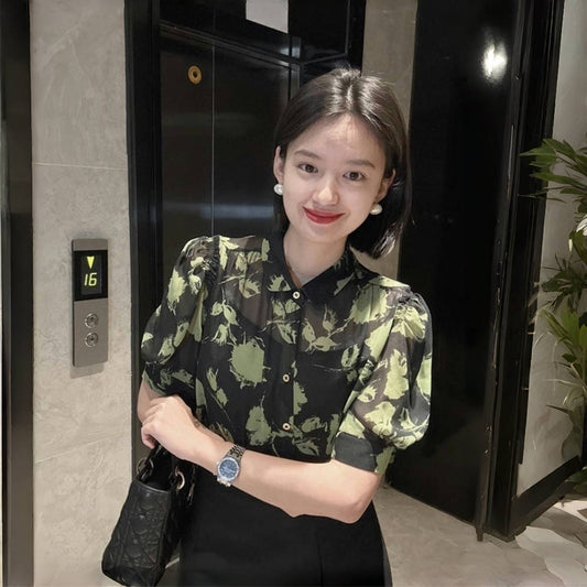 【トップス】真夏の復古 グリーン油絵 ランタン袖 UVカットシャツ【JZシリーズ】【SHシリーズ】