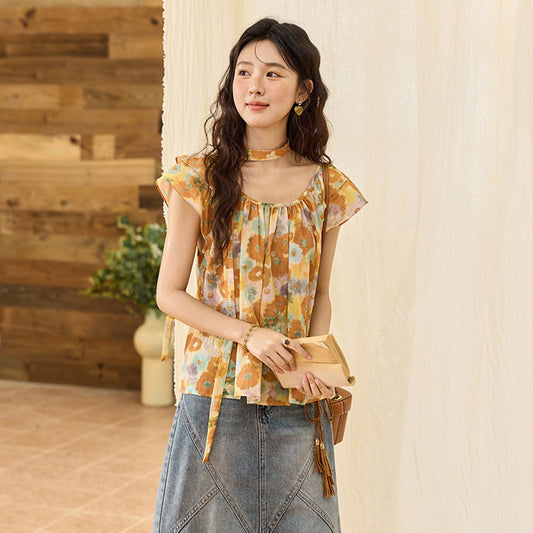 【トップス】夏 花柄 レトロ パフスリーブ タンクトップ シャツ【SHシリーズ】