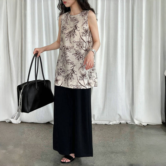 【トップス】夏 リネン生地 プリント ノースリーブ ブラウス 【SHシリーズ】