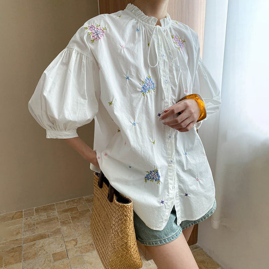 【トップス】初秋新作 フレンチ風花柄刺繍ブラウス|フリルネック×リボン付きスタンドカラー|パフスリーブが可愛い長袖トップス【SHシリーズ】