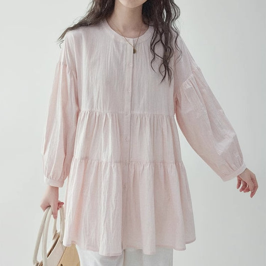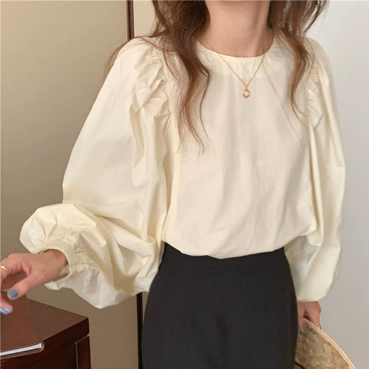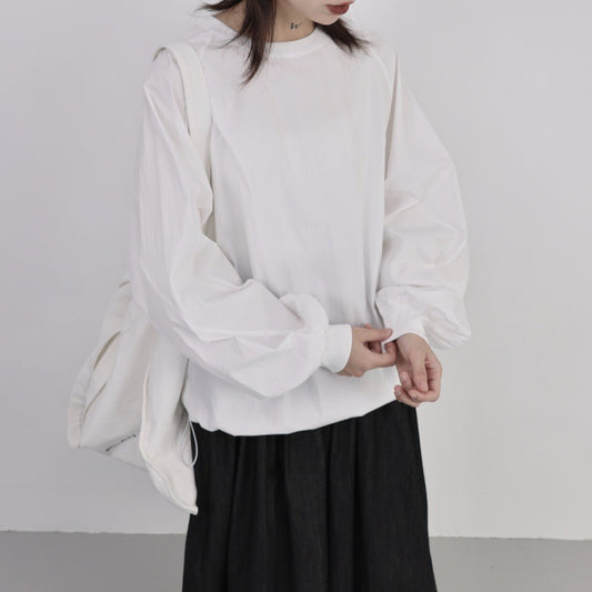 【トップス】春秋 シンプル ラウンドネック ルーズ 無地 パフスリーブ シャツ