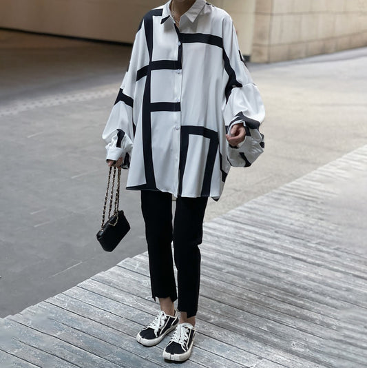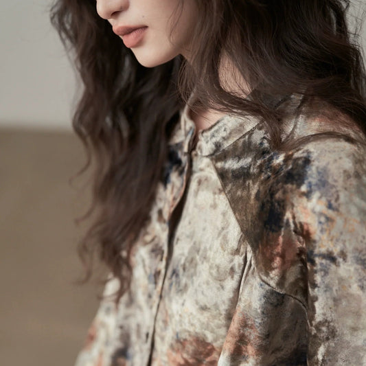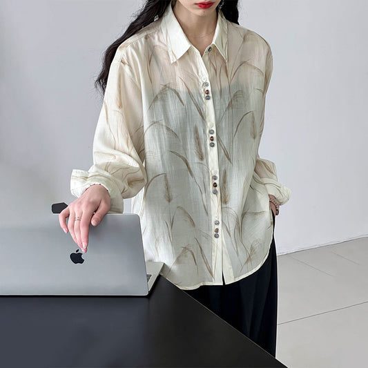 【トップス】春夏秋 文芸的 水墨画風 プリント ルーズフィット シャツ【SNシリーズ】