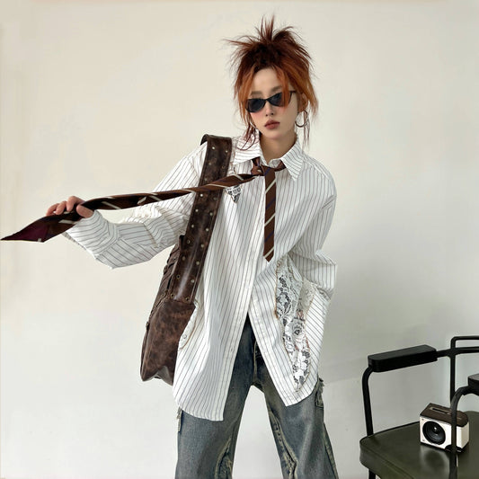 【トップス】春秋 カジュアル レース 切り替えししま模様 シャツ【FCシリーズ】