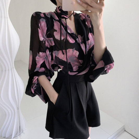 【トップス】韓国 chic 春夏向け おしゃれ Vネック 蝶プリント 長袖 ブラウス【SHシリーズ】