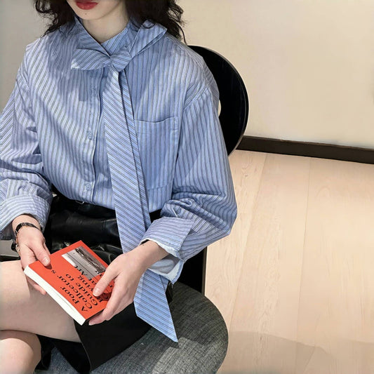 【トップス】春秋冬 ストライプ柄 ブルー ゆるリラックス エレガント シャツ·ブラウス 【SNシリーズ】