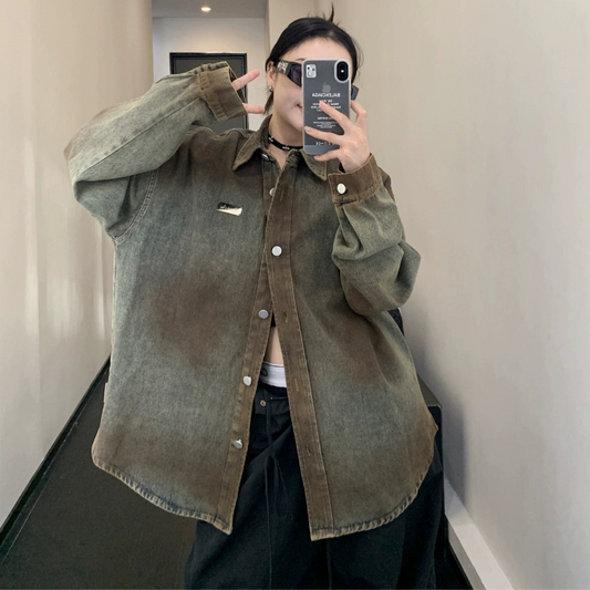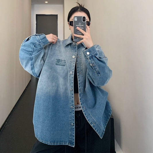 【トップス】春秋 アメリカンスタイル ヴィンテージ加工 グラデーション 刺繍 デニムシャツジャケット【FCシリーズ】