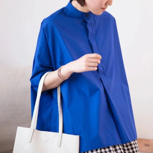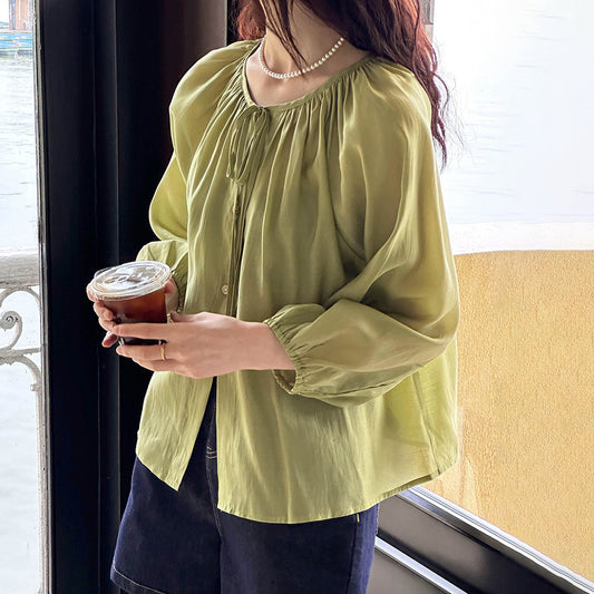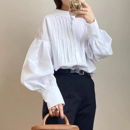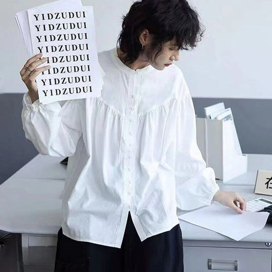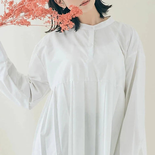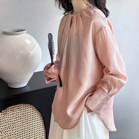 【トップス】春夏秋 ゆるリラックス 立襟 プリーツ 長袖シャツ·ブラウス