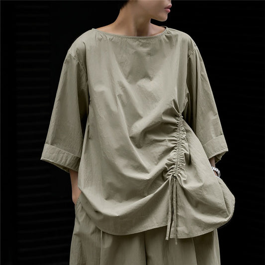 【トップス】 ラウンドネック 夏 プリーツシャツ