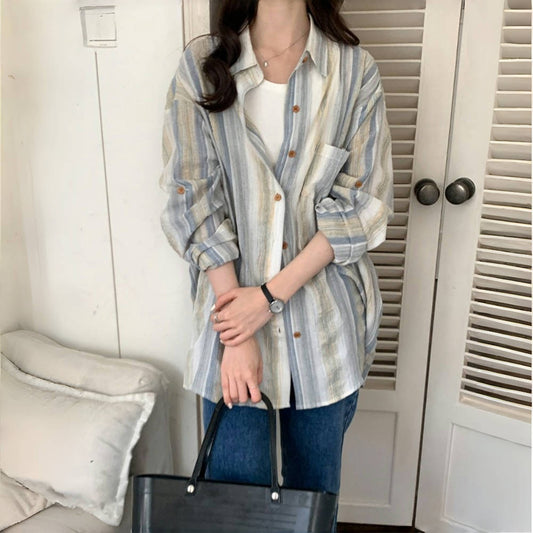 【トップス】春秋 韓国風 配色 しま模様 シャツ 【SNシリーズ】